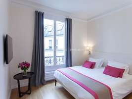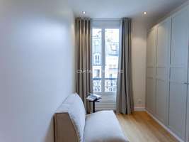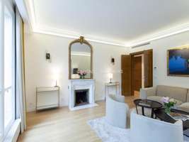 110 m2² 4e étage, immeuble pierre, ascenseur, entrée, double séjour/salle à manger, 3 chambres sur cour (lits 160 cm, lits simples), 2 salles de bains dont 1 avec WC, WC séparé, cuisine bien équipée (LL/S, LV, fours) avec coin repas ; chauffage central + eau chaude immeuble, mobilier contemporain de qualité, placards, TV, Refait à neuf, parquet, clair, moderne, balcon, standing, près Champs Elysées.