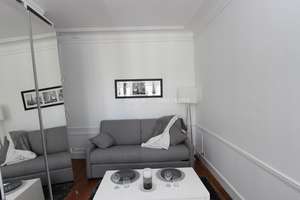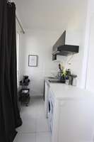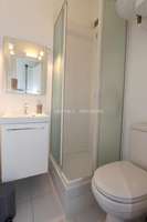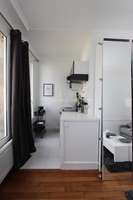 16 m2, 4e étage, immeuble 1900, ascenseur, entrée, pièce principale, avec canapé-lit rapido, salle de douche avec WC, kitchenette équipée (LL, four micro-ondes) ; chauffage électrique, double vitrage, mobilier moderne, placards, TV, refait neuf 2016, parquet, moderne, clair, bon quartier.